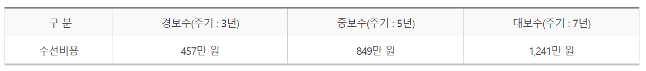 주택을 수선하는 비용은 주택이 얼마나 낡았는지를 경,중,대보수별로 구분하고 표에 적합한 정도를 책정해서 지원합니다. 경보수는 457만원이고 중보수는 849만원이며 대보수는 1,241만원 입니다.