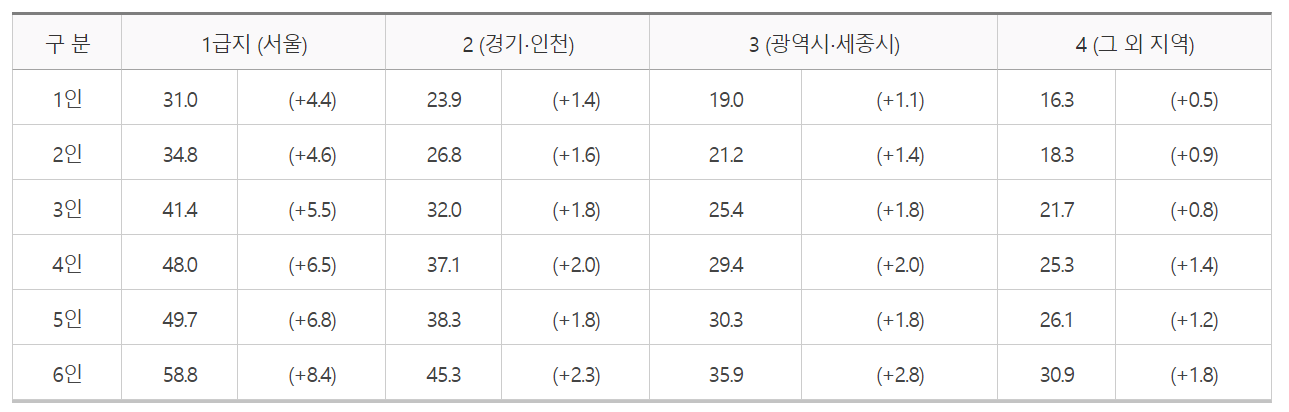 2022년과 2023년 사이의 중위소득을 비교해봅니다. 우선 1인 가구 기준으로만 놓고봐도 작년에 비해 올해는 7만원 가량이 상승했다는걸 알 수 있습니다. 2인 가구의 경우에는 299만 vs 308만원이니까 대략 9만원 정도 올랐네요. 가장 많은 4인가구의 경우도 보면 7만원이 올라서 올해는 398만원을 벌면 중간 소득자로 보고 있네요.