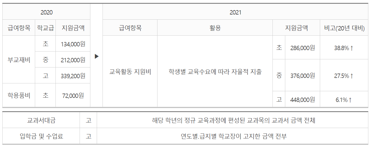 중위소득 50% 이하면서 초,중,고등학생 자녀를 둔 학부모님들은 아이들 교재비랑 학용품비 심지어는 입학금과 수업료까지 보조 받을 수 있습니다. 복지국가로 나아가는 길목에서 여러모로 다양한 지원을 아끼지 않고 있는걸 알 수 있지만 아직도 멀었다고 생각합니다.