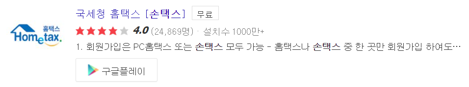 손에서 이뤄지는 홈택스라는 명칭인가 봅니다. 구글스토어에는 이런 앱도 있습니다. 설치수가 1,000만이 넘어갈 정도로 대히트 앱입니다. 아니 히트라고 말하기도 애매한게 이건 어차피 이용할 수밖에 없도록 만들어진 것이라 보니 어쩔 수 없긴 하네요.