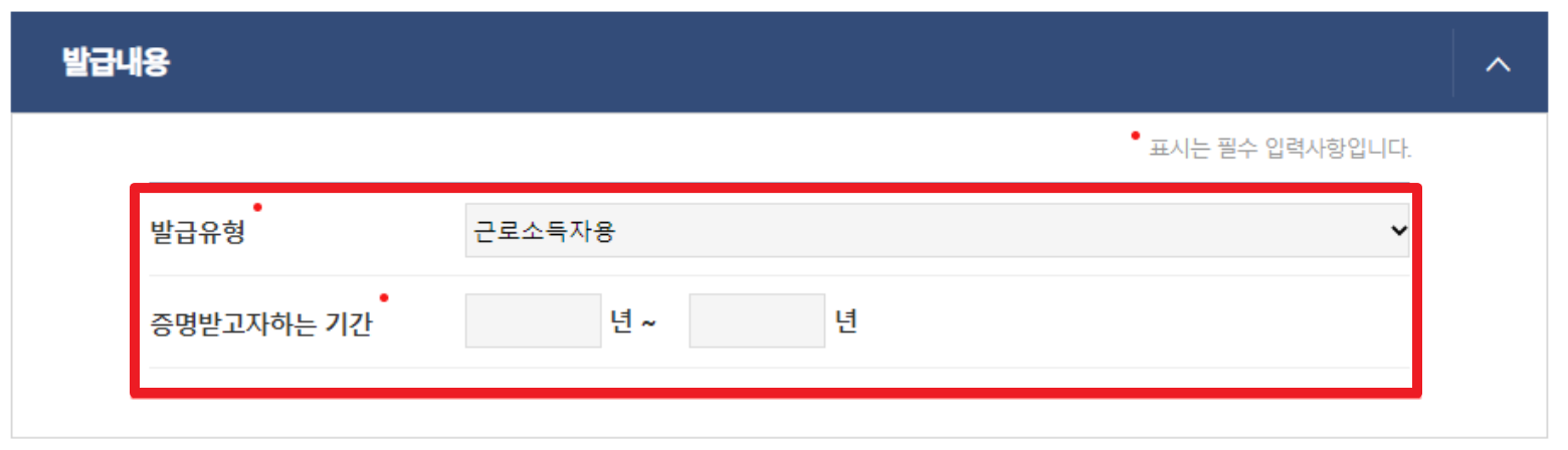 7. 발급유형은 연말정산이나 종합소득세면 해당 용도에 맞게 체크하시면 됩니다. 고용안정이나 한시적지원금의 경우에는 어떤걸 택하든 크게 상관은 없습니다.