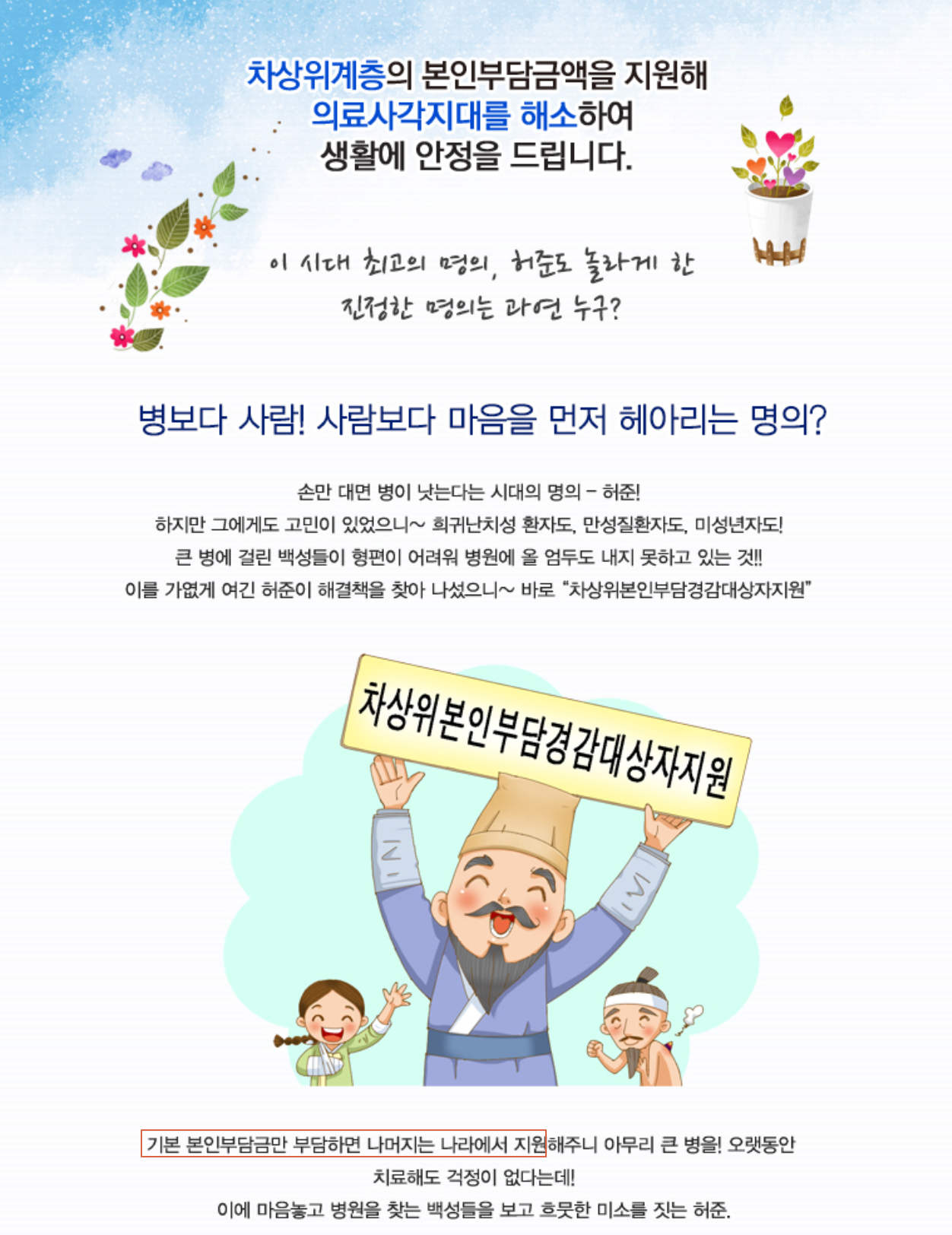 희귀난치성 및 중증 질환자, 만성 질환자 등 치료가 필요한 차상위계층의 요양급여 비용 중 본인이 부담해야 하는 금액을 나라에서 지원해드립니다.