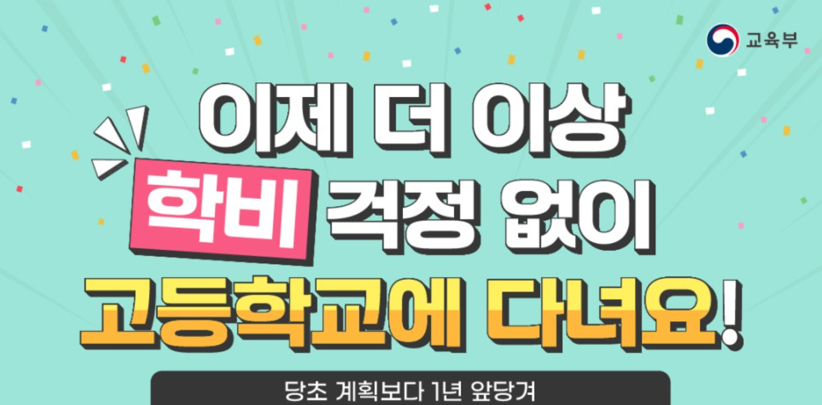 이제 더이상 학비걱정없이 고등학교 다닐 수 있도록 교육부에서 1년의 기간을 앞당겨서 2023년 새학기에 고등학교 무상교육을 전 학년도에 실시합니다.