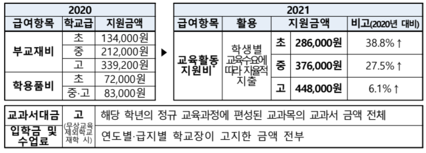 초등학생은 286,000원으로 38.8%가 올랐고 중학생은 376,000원으로 27.5%가 상향됐고 고등학생은 448,000원으로 6.1%가 증가했습니다. 또한, 교육비 대상자로 선정된다면 입학금, 수업료, 급식비, 교과서비 및 방과후학교 자유수강권을 연 60만원 이내 받을 수 있습니다. 컴퓨터, 인터넷 통신비를 연 23만원 이내로 지원받을 수 있습니다.