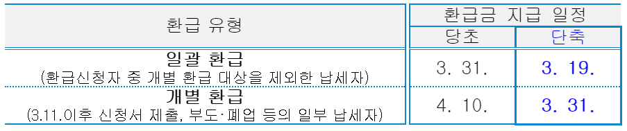 3월 31일 일괄환급 지급시기 였던걸 단축해서 3월 19일날 지급한다고 합니다. 개별환급은 4월 10일이였으나 이또한 열흘 정도 앞당겨 3월 31일날 드립니다. 이렇게보면 삼월 중으로는 다들 받을 수 있겠네요. 제대로 알아보세요.