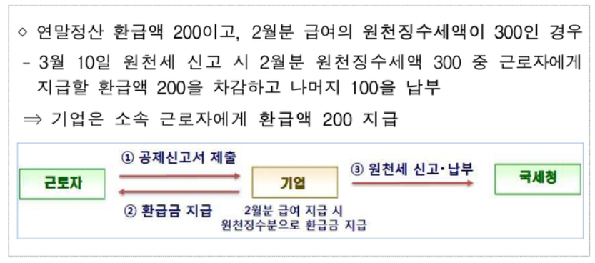 원천징수 의무자(기업)가 소속 근로자의 연말정산을 계산해본 결과, 환급세액이 추가 납부할 세액보다 많은 경우에는 환급받습니다.
