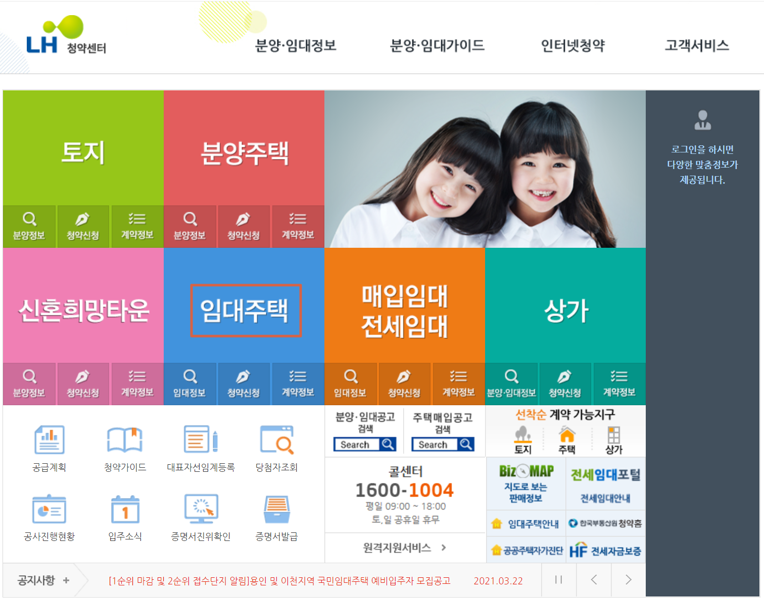 2. 싱그러운 아이들의 미소 아래보면 파란색 배경의 '임대주택'이란 글자가 보입니다. 여기서 왼쪽 돋보기 아이콘을 클릭합니다. 임대정보라고 적혀있죠.