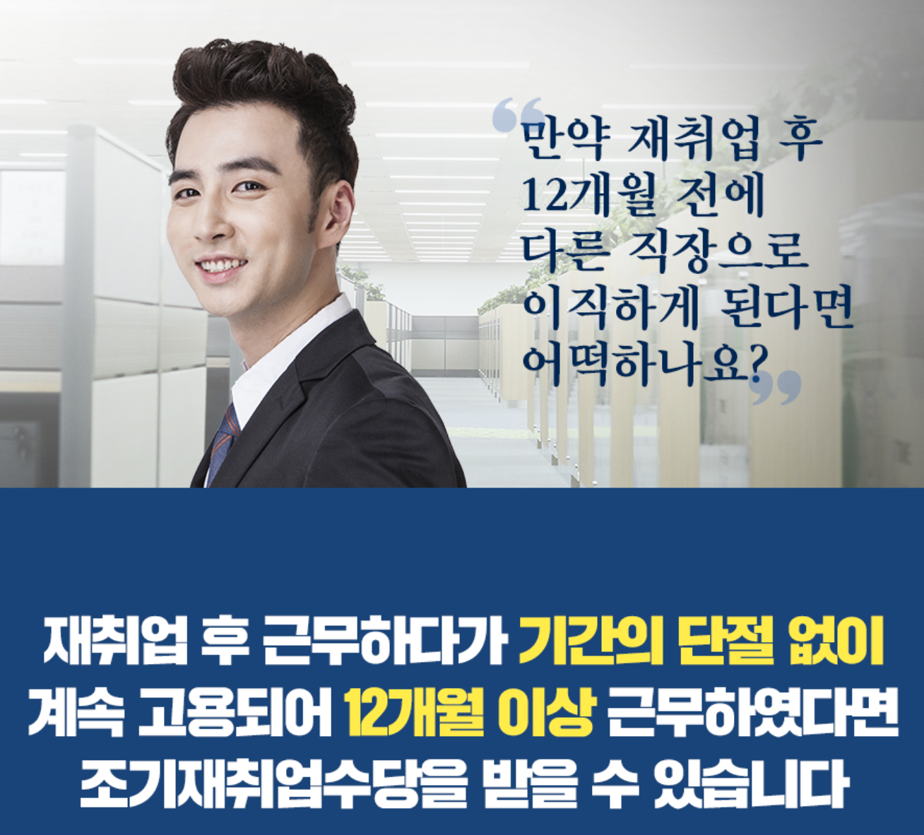단, 여기서도 취업과 마찬가지로 새롭게 시작하는 사업은 12개월 이상 지속한 경우에만 재취업수당을 받을 수 있습니다. 약간의 주의사항만 기억하고 있다면 고용정책에 대한 이해가 크게 어려워보이진 않네요.