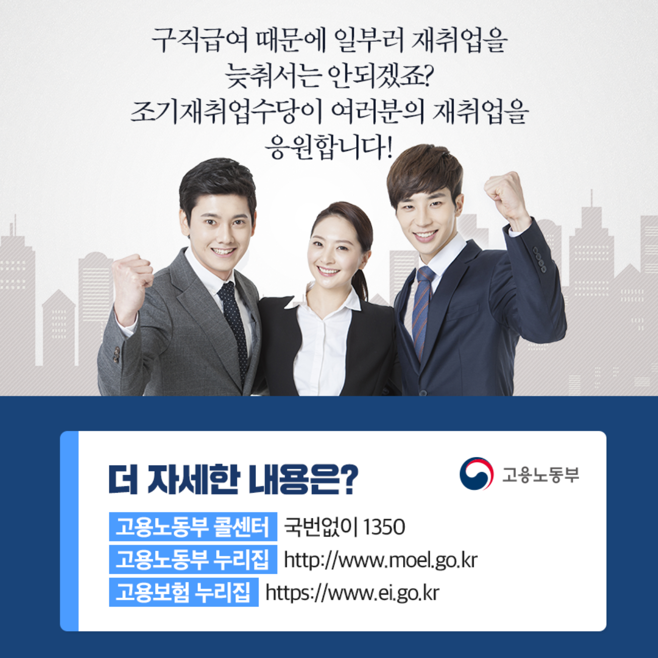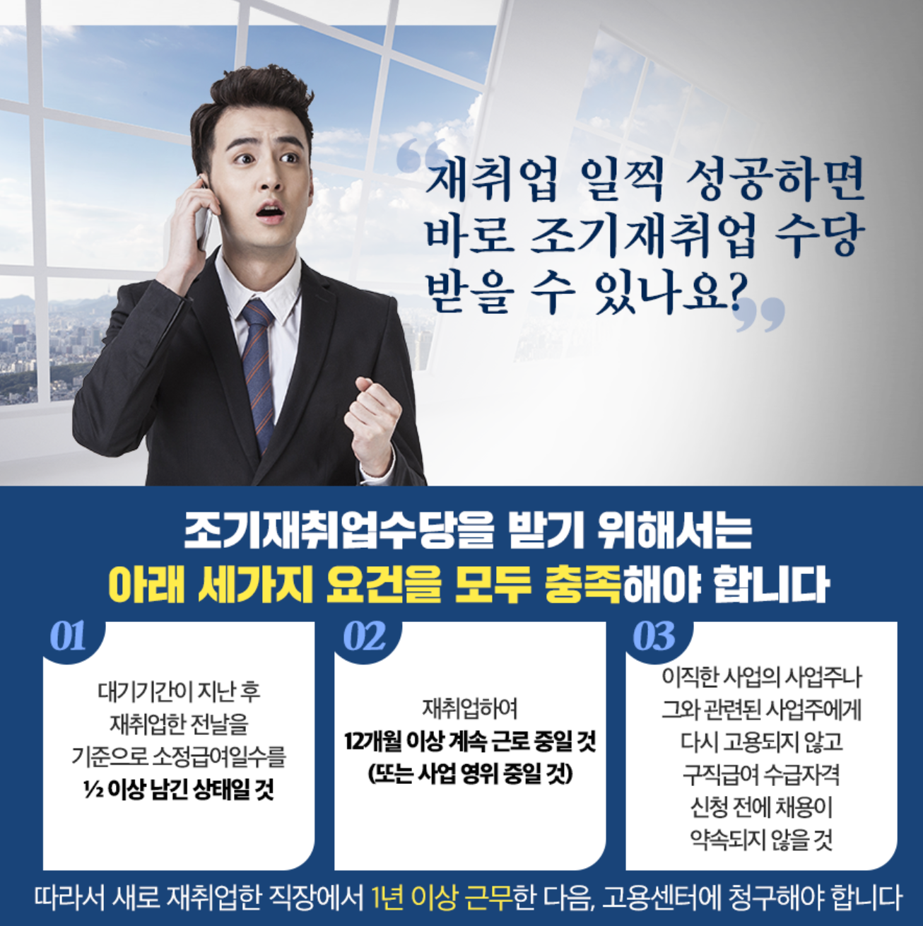 이중, 취업촉진을 목적으로 배정되는 금액이 조기재취업수당이란 것입니다. 이름만 들어도 어떤 의미인지는 다들 아시리라 생각합니다만 아래처럼 세가지 조건을 충족해야만 합니다.