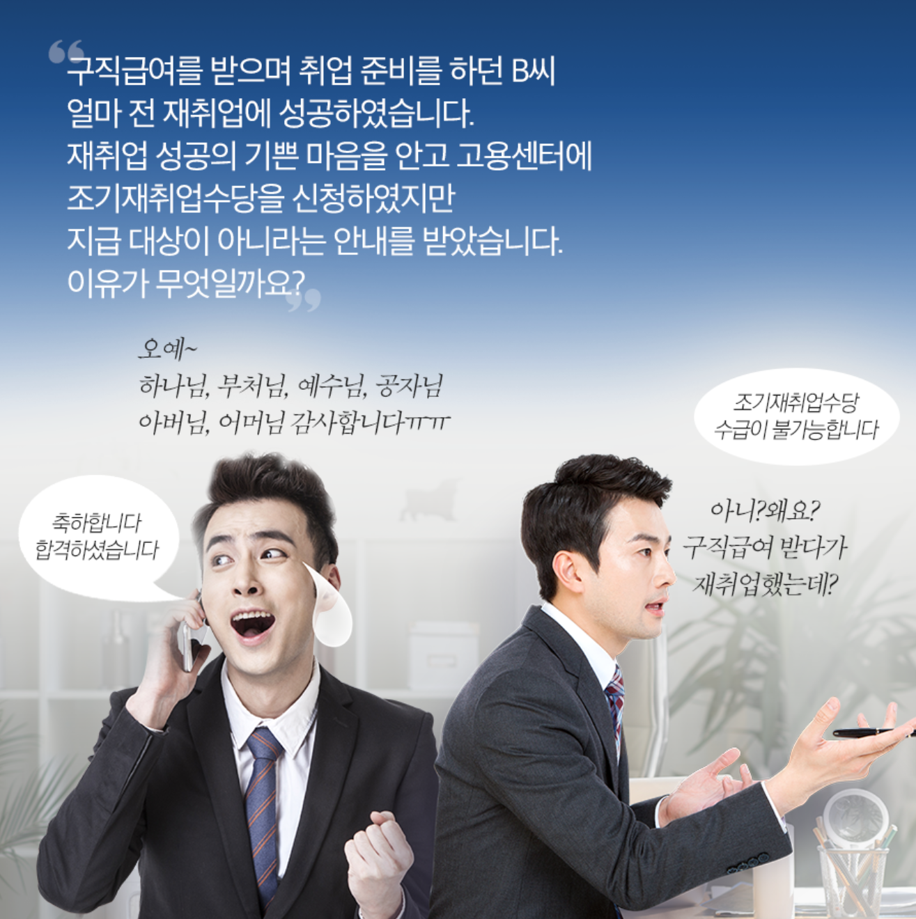 구직급여를 받다가 취업 준비를 하던 B라는 사람이 있다고 해봅시다. 얼마전에 대기업으로 입사를 하게 됐습니다. 코로나19 상황을 극복하고 오랜만에 실직자 생활을 탈피할 수 있었고 고용센터로 가서 조기취업 대상자로 생각해 신청해보니 수당은 안준다고 합니다.