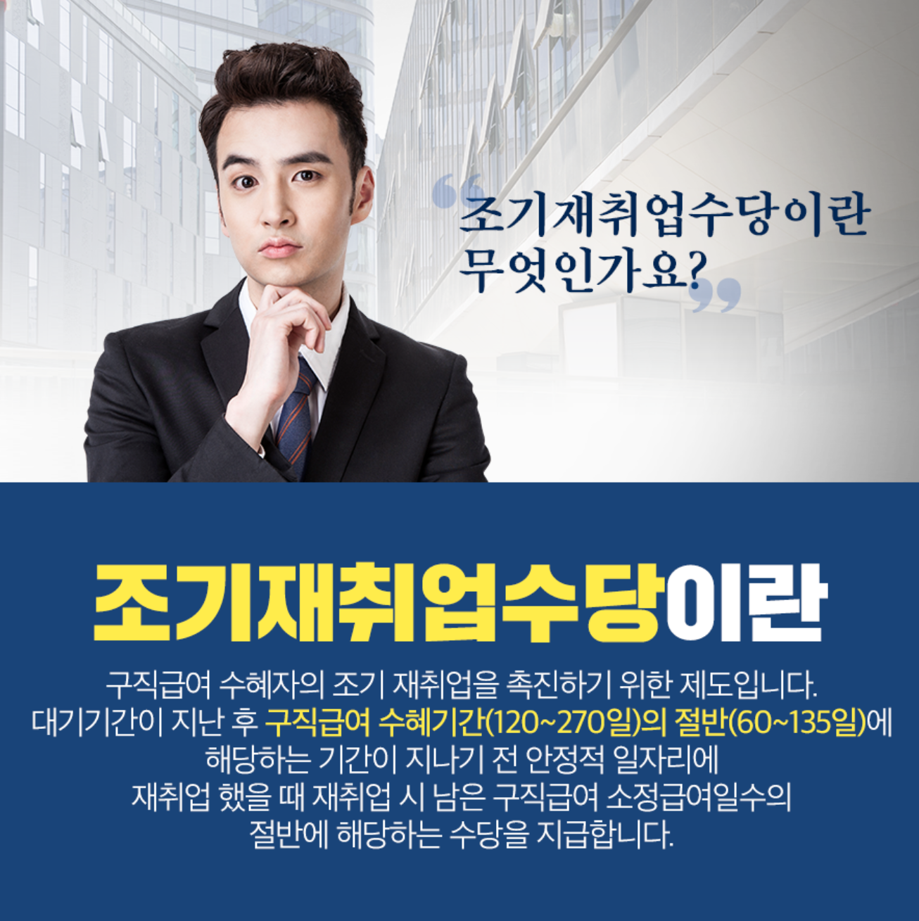 제가 지난번에 언급을 한 바 있는 용어입니다. 구직급여를 받는 구직자가 좀더 빨리 취업할 수 있도록 지급하는 지원금을 의미합니다. 구직급여 수혜기간은 120일 ~ 270일의 절반인 60~135일에 해당하는 날짜가 지나가기 전에 오랫동안 일할 수 있는 근무지로 다시 취업을 했을 경우를 전제로 합니다.