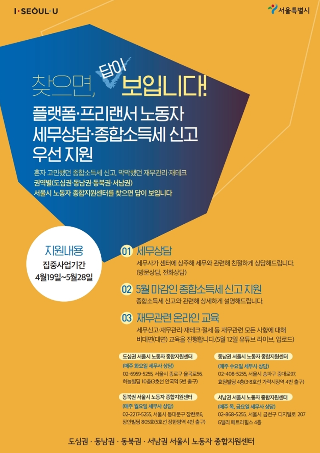 5월은 종소세 신고하는 달입니다. 플랫폼 운영자나 프리랜서 노동자와 배달 알바에 종사하는 분들을 위해 세무사가 센터에 상주하면서 직접 도움을 드린다고 합니다. 꼭 방문할 필요는 없는만큼 세금신고에 어려움이 있다면 이용하세요.