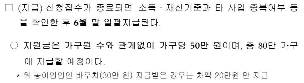 신청접수가 종료가 되면 소득과 재산을 먼저 보고 타 사업과 중복된 사람인지 아닌지까지 검토를 거친 후 6월 말 가구당 50만원을 지급합니다. 단! 기존에 농어임업인 바우처 30만원을 받았다면 차액은 20만원만 드립니다.