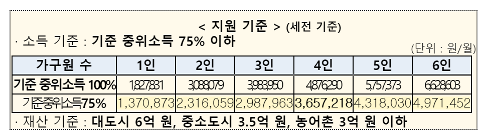 재산기준으로 대도시는 6억원 이하, 중소도시 3억 5천만원 이하, 농어촌 3억원 이하인 분들을 전제로 합니다. 그다음 따져보는건 소득입니다. 매달 얼마씩 벌이가 있는지를 보는 것이죠. 명심하세요. 재산과 소득을 본다는 사실을 말이죠.