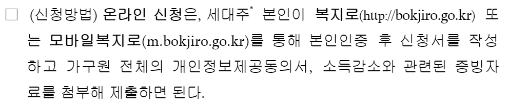 집안의 가장인 세대주 본인이 직접 해야합니다. PC 또는 모바일로 복지로 들어가서 본인인증하고 신청서를 작성하면 됩니다. 현장으로 가는 것도 하나의 방법이긴 하지만 이게 훨씬 더 수월합니다.