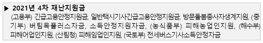 2021년 4차 재난지원금을 받은 분들은 안됩니다. 이번에 한시 생계지원금을 드리는 가장 큰 목적은 어디에도 속하지 못한 분들입니다. 지난번 받은 분들이 또 받게된다면 생계지원을 받는 분들의 기분이 좋지 못할 겁니다.