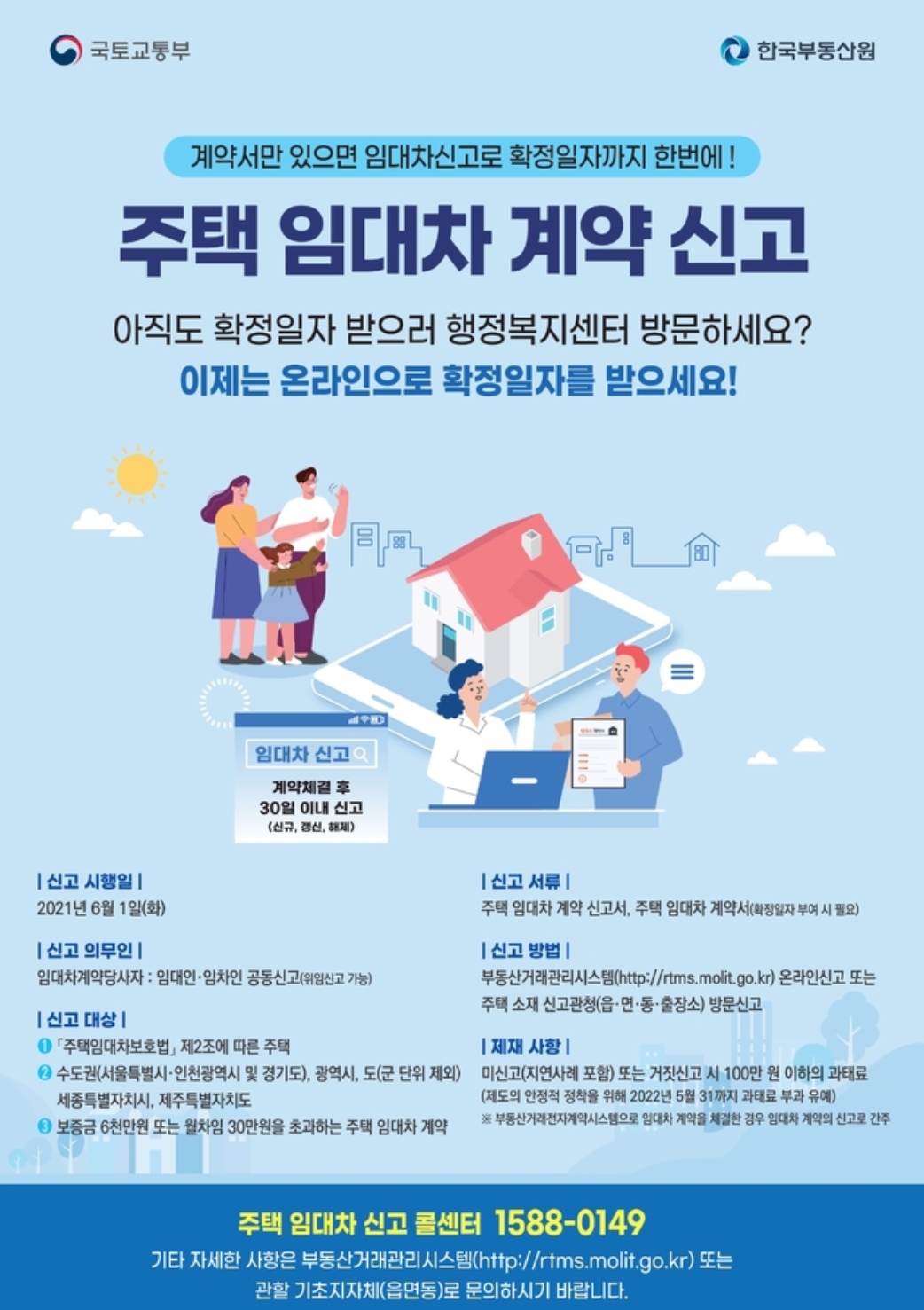 주택 임대차 계약신고가 6월 1일부로 전국적으로 의무화 시킵니다. 나라에서 명확하게 세금 탈세 여부를 확인하고 감시하기 위한 법령을 제정하고 본격적인 시행을 진행합니다. 정부에서는 임대차 정보를 투명하게 공개하고 주거안정성을 높인다는 취지입니다. 자세한 내용은 해당 정보를 따라가시길 바랍니다.