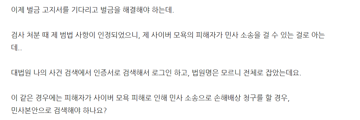 사이버 모욕죄로 직고소를 당하고 약식으로 검사 처분을 받았습니다. 벌금이 과하다고 생각해 정식재판을 청구해 50만원을 깍은 상태로 판결이 선고되었습니다. 이제 벌금 고지서를 기다리고 해결만 하면 되는데, 제 사이버 모욕으로 인한 피해자가 민사소송을 걸 수도 있을까 염려됩니다.