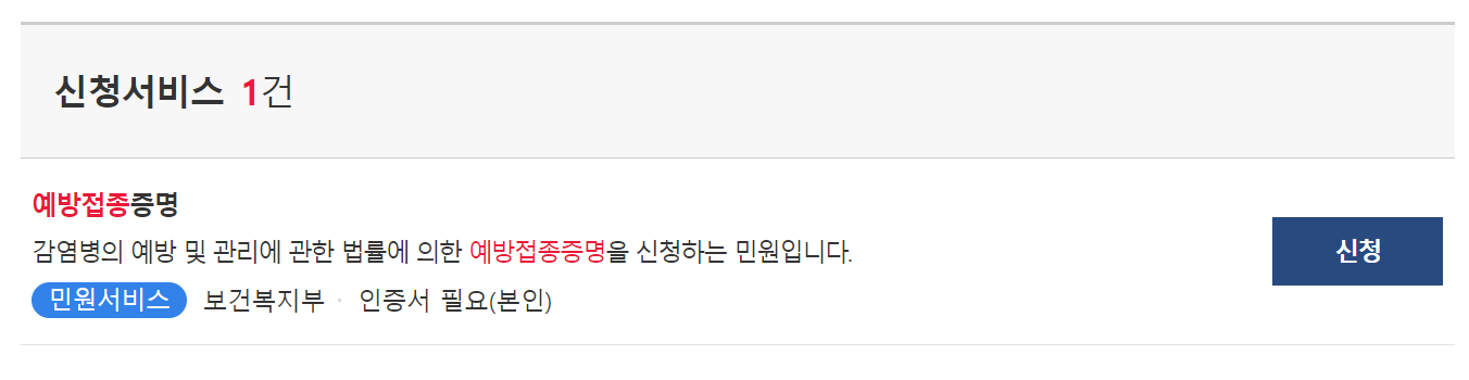 민원서비스로 감염병의 예방 및 관리에 관한 법률 민원을 발급받을 수 있습니다. 진행하는 상세과정은 매우 간단해서 패스합니다. 본인의 공동인증서 정도만 챙기면 무사 통과합니다.