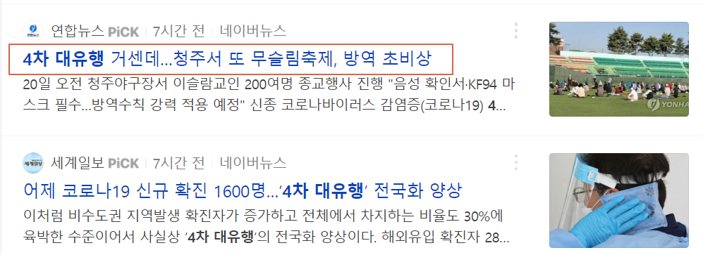 4차 대유행이 거세다는 기사와 함께 청주에서는 무슬림 축제가 한창이라고 합니다. 200여명의 종교행사가 진행된다고 하네요. 이외에도 전국적으로 수많은 집단들이 모이기를 반복하고 있습니다. 음주가무를 사랑하는 민족답게 거리두기가 완화된 곳이라면 1시간도 더 걸려서라도 찾아가고 있죠.