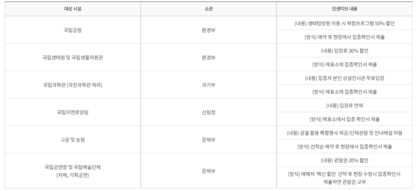 이렇게 접종을 무사히 완료하고 24시간이 지나게 되면 예방접종 증명서를 종이 또는 모바일로 발급받을 수 있게 됩니다. 우리나라 정부에서는 접종을 장려하고자 공원 및 휴양림과 농원 등의 입장료를 면제하는 등 인센티브를 드리고 있으니 동참해주시길 바랍니다.
