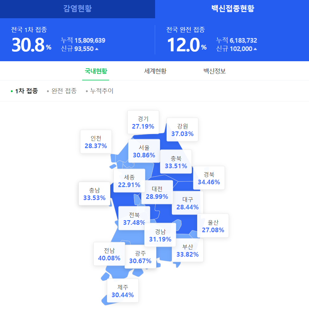 전국 1차 접종현황은 30.8%를 기록중이며 완전 접종이라 불리우는 2차까지 끝마친 사람들은 12%에 그치고 있습니다. 아직까지 갈길이 상당히 멀다는걸 알 수 있습니다. 특히나 경기도 지역과 세종시 및 울산 그리고 인천과 대구,대전 등은 20%대에 머물고 있습니다.