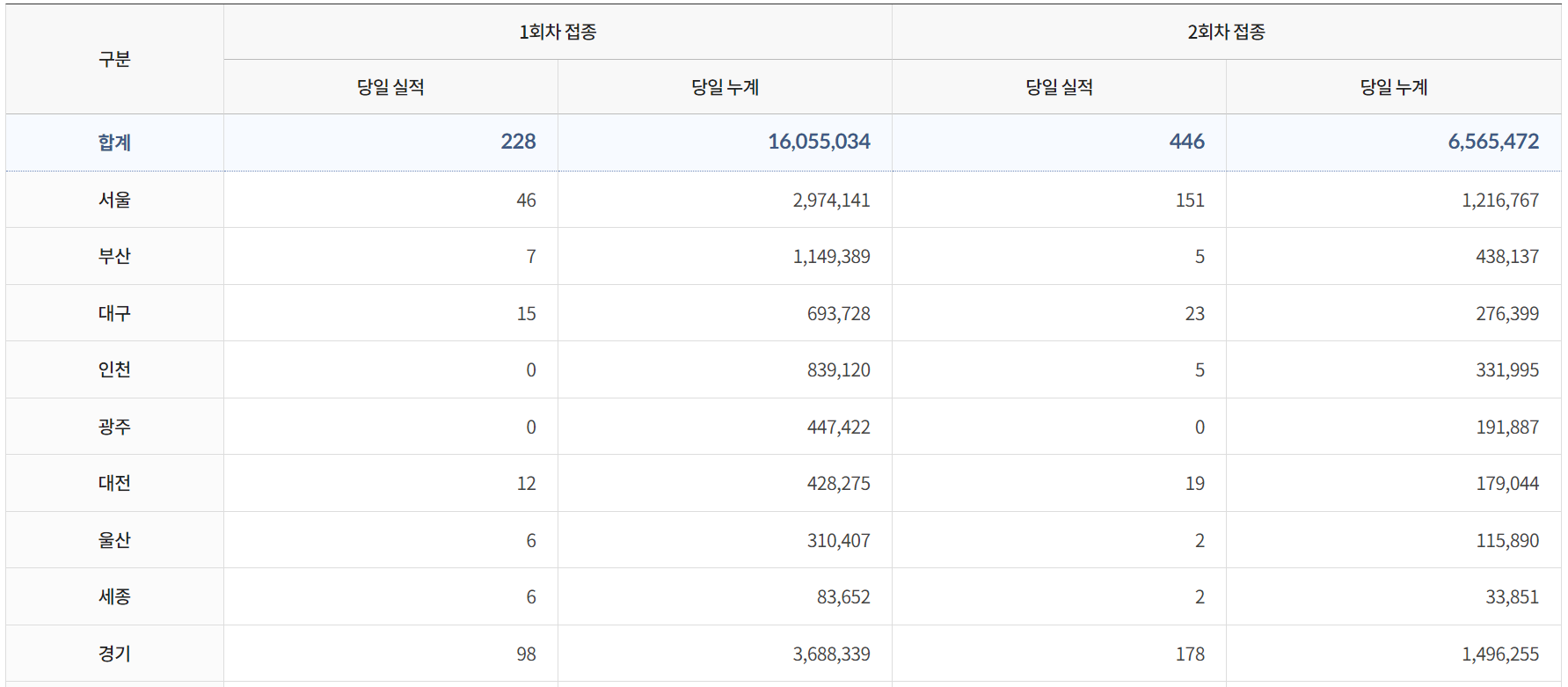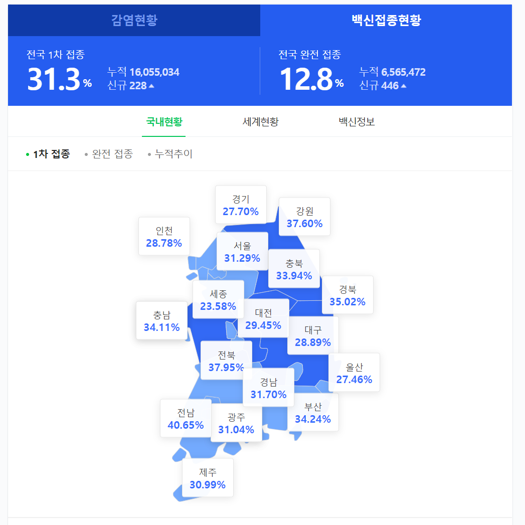 전국 1차는 31.3%를 기록중이며 완전 접종은 12.8%를 채운 상태입니다. 경기와 인천은 인구수가 상당히 많은데 반해 30%도 넘지 못하고 있습니다. 분발해야 할 것으로 보입니다. 전남은 칭찬할만 하네요. 벌써 40%를 유일하게 돌파했으니 말이죠.