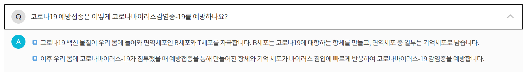 백신을 맞게되면 어떤 식으로 바이러스 감염증을 예방할 수 있는지 묻는 질문입니다. 이에 대한 답변으로는 코로나19 백신을 투여하면 접종을 통해 만들어진 항체와 기억세포가 바이러스 침입에 빠르게 반응하여 처단한다고 하네요.