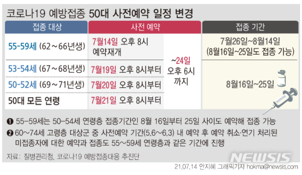 50~52세 및 53~54세까지 백신분할 사전예약을 실시합니다. 7월 19일은 고등학교 3학년 학생들과 교직원들이 실제로 화이자 백신을 접종받는 날이기도 합니다. 이제는 좀더 숨가쁘게 움직여야 할 때입니다. 같은날 50대 후반 또한 계속해서 모더나 백신을 접수 받습니다.