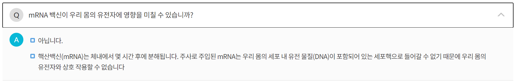 mRNA가 우리 몸으로 들어오면서 유전자에 영향을 미칠 수 있을까?에 대한 궁금증입니다. 이에 대한 답은 세포핵으로 들어갈 수 없기에 유전자에 문제를 일으키지 않으니 안심하라는 말이였습니다.