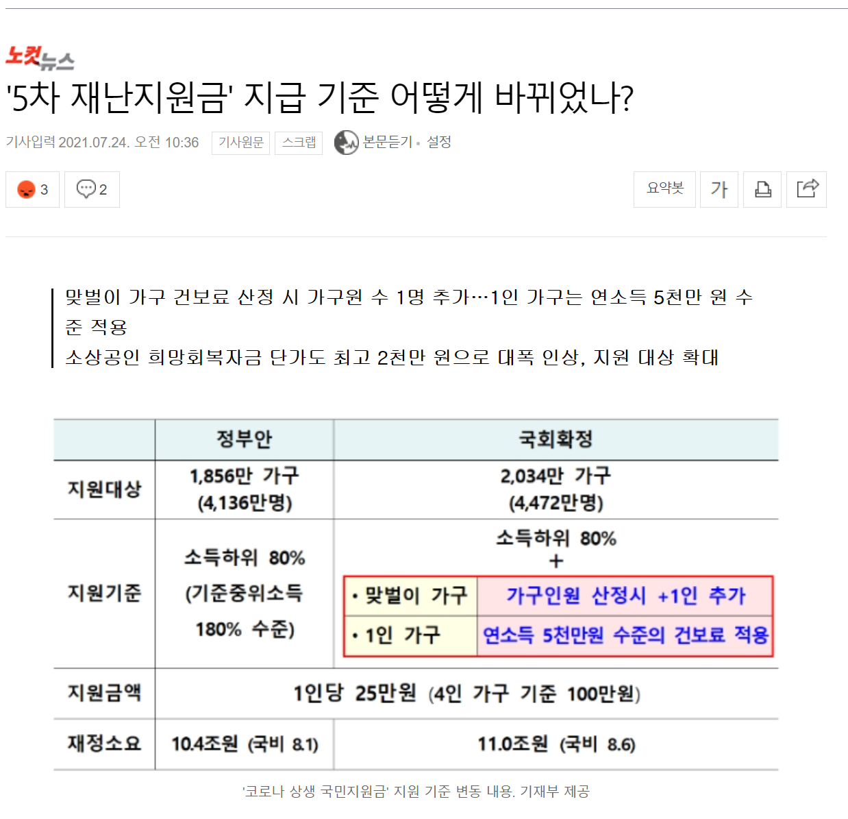 표로 정리해서 보니까 상당히 보기 수월하죠? 이렇게 증액을 결정하고 나니 정부에서 맨처음 요구했던 대상자인 1,856만 가구(4,136만명)에서 2,034만 가구(4,472만명)으로 포함되는 분들이 늘었습니다.