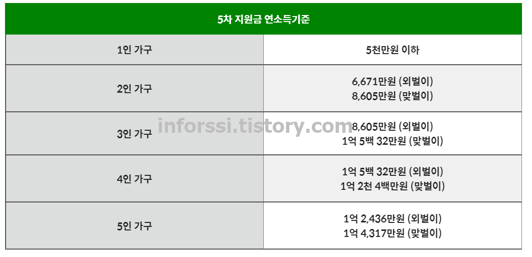 5차 재난지원금 연소득 기준표