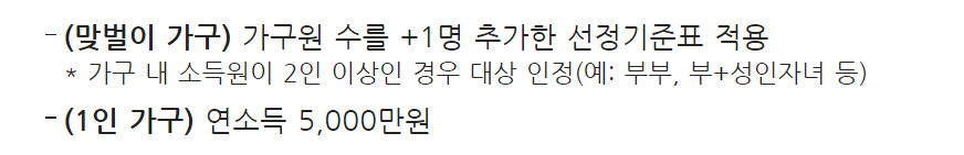 맞벌이 가구는 가구원 수를 1명 더 추가해서 선정기준표를 적용하게 됩니다. 가구내 소득을 발생시키는 분들이 2인 이상이라면 대상으로 인정합니다. 예를 들자면 부부끼리도 되고 부모 중 한명이나 20살 넘어서 직장 생활하면서 월급타는 자녀 등입니다.