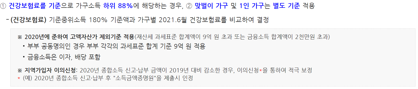 그동안은 어디서 어떻게 받는건지도 추측이였고 아득한 상상과도 같았지만 이제는 명확한 기준이 나온 상태입니다. 건강보험료를 기준으로 가구소득 하위에 놓인 88%~90%에 해당한다면 됩니다. 기준 중위소득 180% 기준액과 더불어 2021년 대상자가 얼만큼 건보료를 납부했지를 보고 체크합니다.