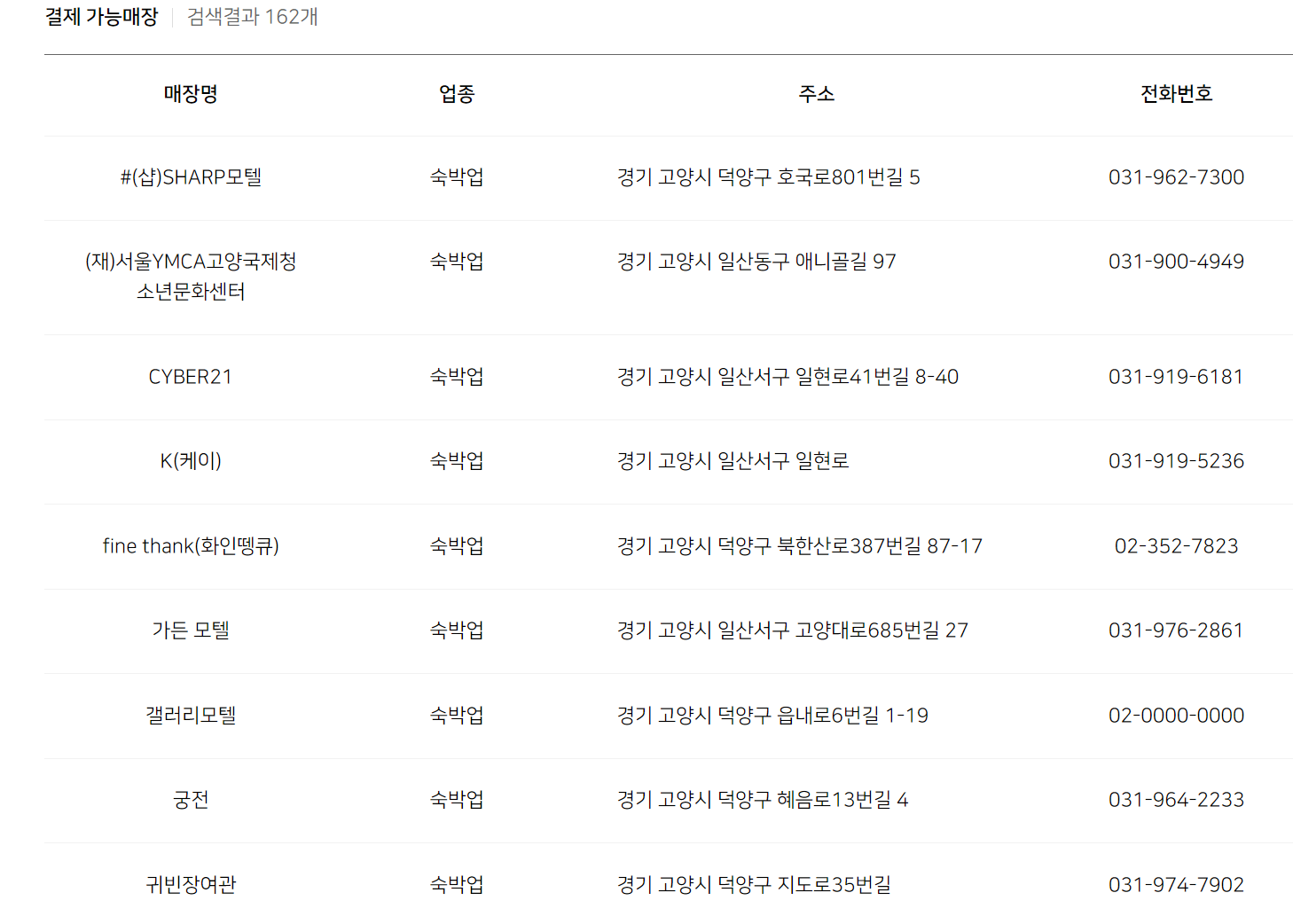 3. 숙박, 여행, 레저, 취미, 주유소 등 어떤 곳에서 쓸 수 있는지 가맹점 리스트를 조회해볼 수 있습니다. PC라면 마우스로 선택하고 핸드폰으로 보고 있다면 손가락으로 눌러서 경기 지역화폐 사용처를 확인할 수 있습니다.