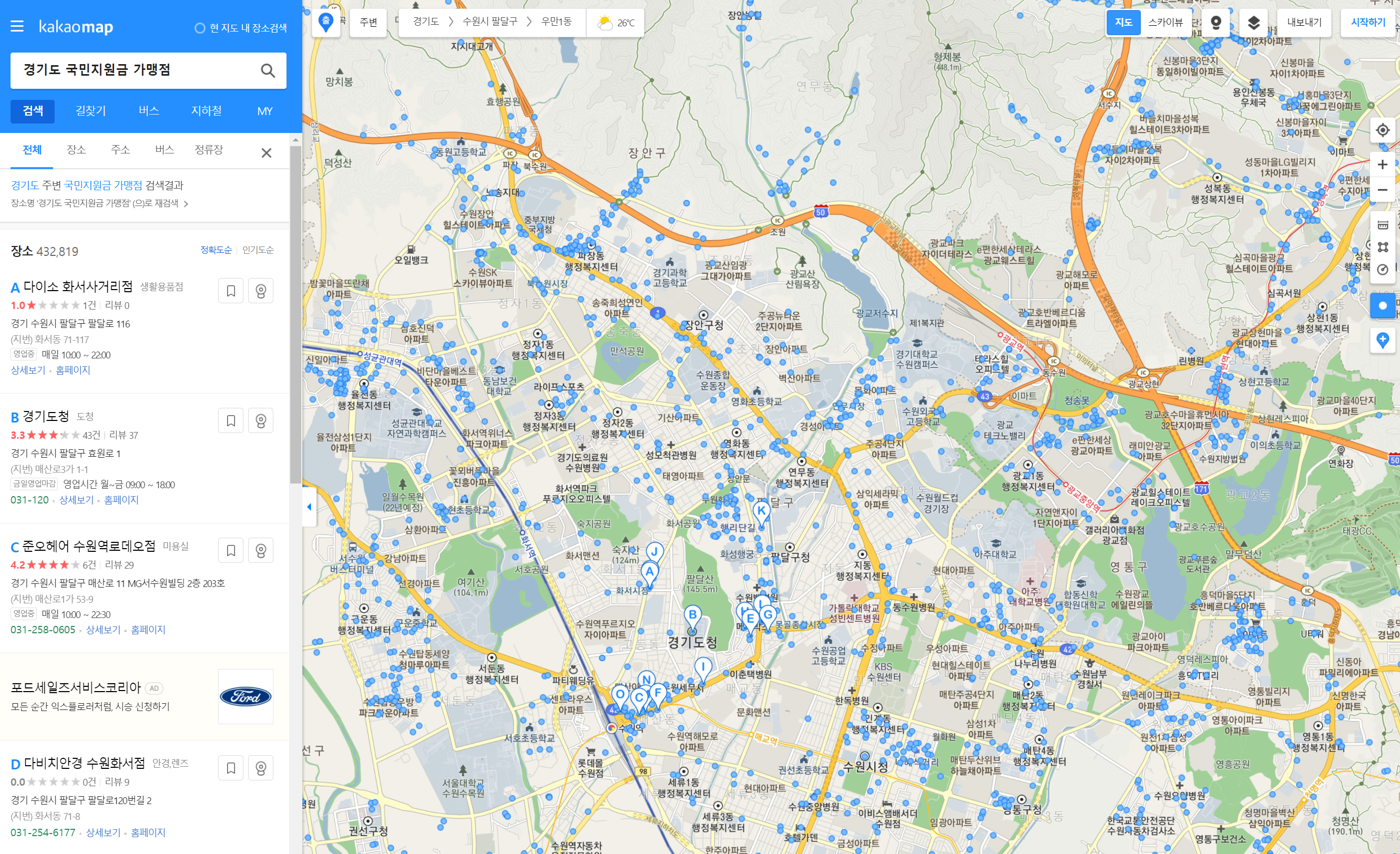 저처럼 '경기도 국민지원금 가맹점'으로 검색하면 지도상에 점으로 표기가 됩니다. PC로 보면 좌측으로 나오고 모바일로 보면 하단에 리스트 형태로 나옵니다. 내 위치 중심인지 지도 중심인지도 GPS를 통해 설정이 가능합니다.