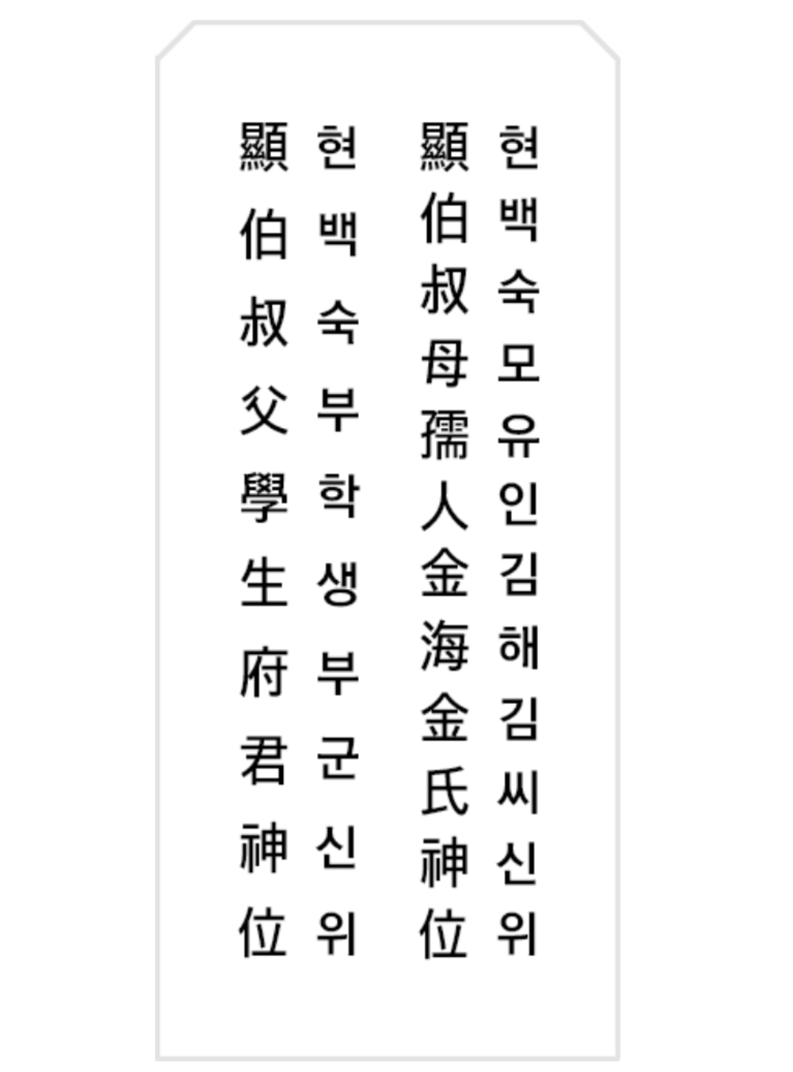 한지를 사용해서 쓰는 것을 원칙으로 하지만 대체재로 A4 용지를 써도 무방합니다. 제사를 모시는 사람을 기준으로 지방을 작성하면 됩니다.