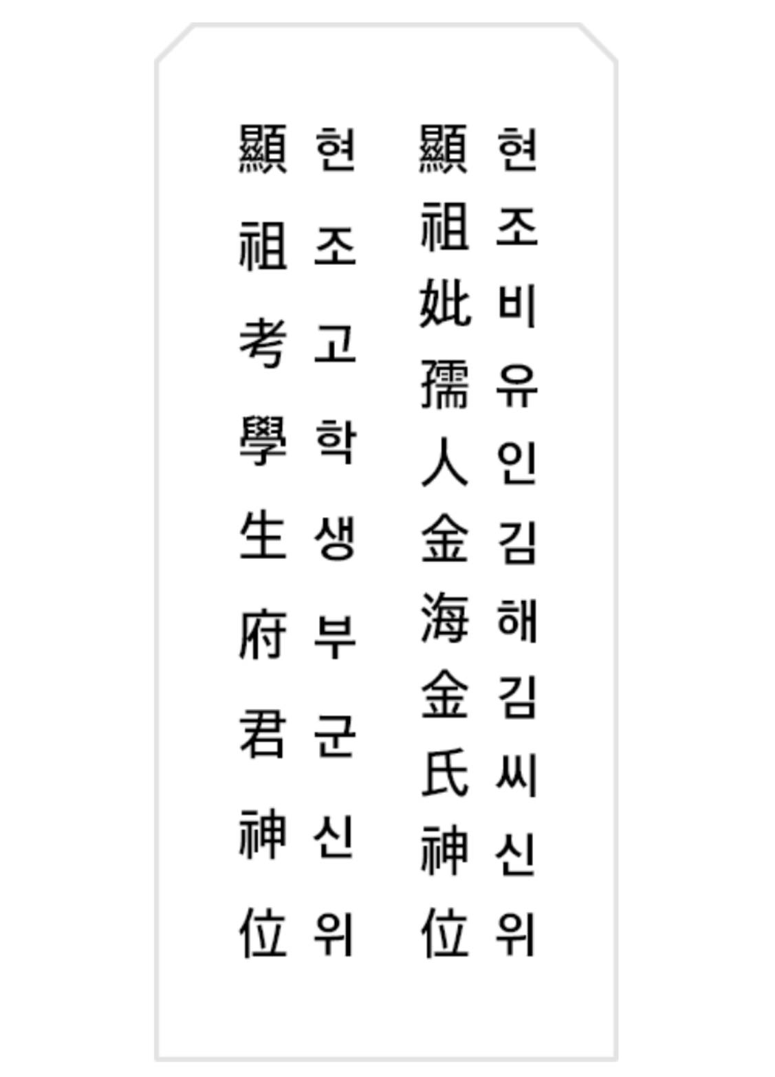 오늘날에는 붓글씨를 통해 일일이 서예실력을 뽐내지 않아도 됩니다. 프린트를 통해 깔끔하게 출력해서 써도 무방합니다. 무조건 형식에 완벽하게 얽매일 필요는 없습니다. 집안 사정에 맞게 변형하고 대체할 건 조절해도 상관없습니다. 조상님들이 너그러이 이해할 수 있는 수준에서 하는걸로 족합니다.