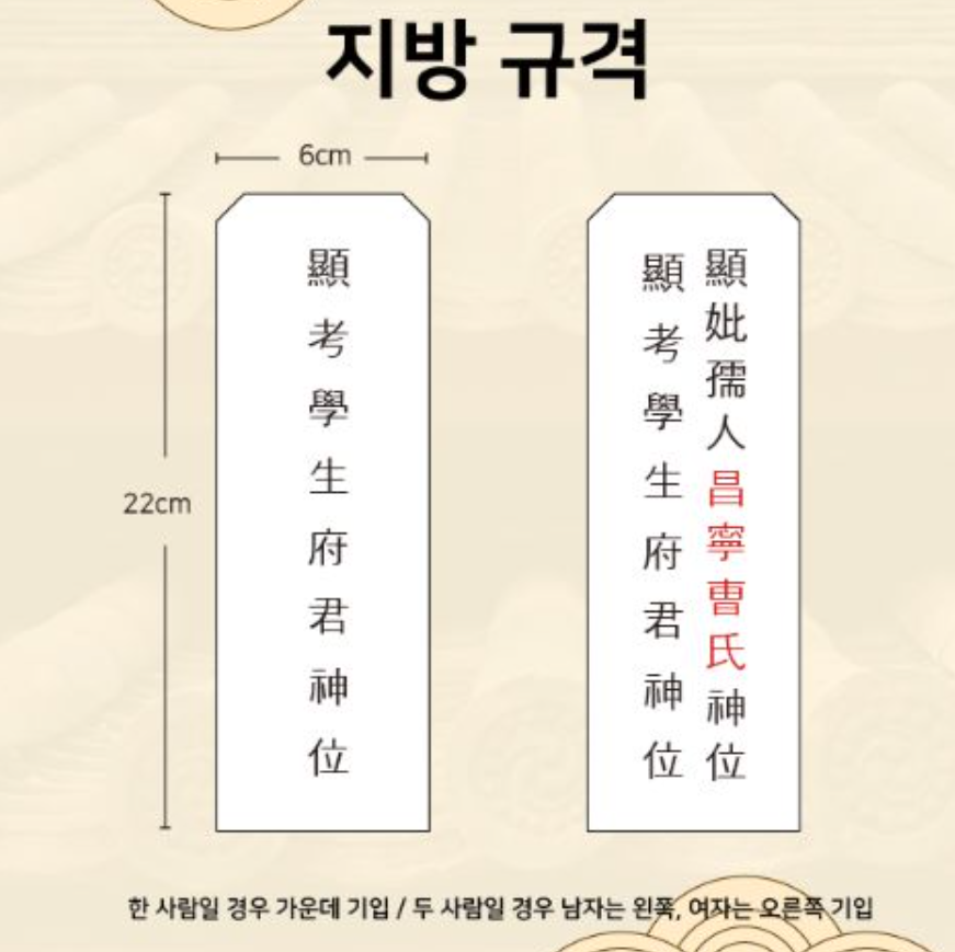 지방에는 고인과 제주와의 관계를 적고 직위를 적으며 고인의 이름과 조상의 위치를 나타내는 문구를 적습니다. 총 4가지의 의미를 담아서 적는다는 특징을 지니고 있습니다. 구체적인 의미까지 설명하는 내용은 패스하니 따로 찾아보심이 좋을 듯 싶습니다.