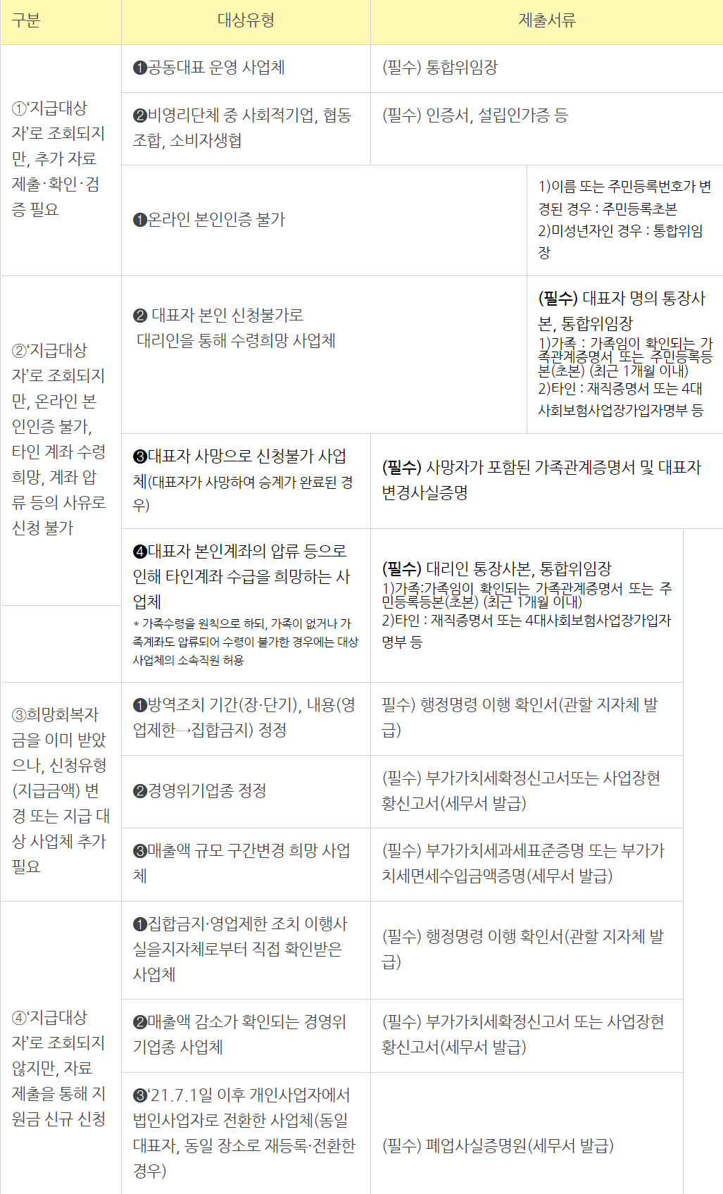 - 지원 대상 사업체를 여러 명이 공동으로 운영하는 경우 공동대표 간 위임장을 제출한 1인에게 해당하는 금액을 지원
