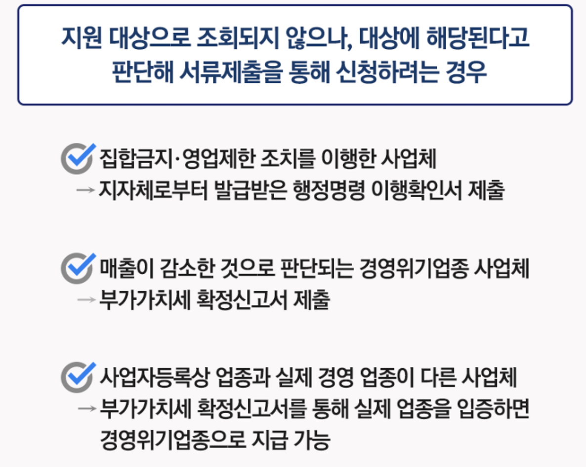 - 집합금지나 영업제한 조치를 이행한 사업체는 지자체로부터 발급받은 행정명령 이행확인서를, 매출이 감소한 것으로 판단하는 경영위기업종 사업체는 부가가치세 확정신고서를 제출