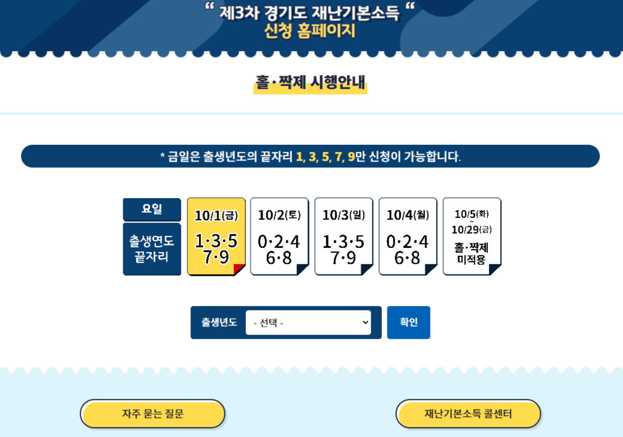 출생연도에 따라 홀수랑 짝수로 구분해서 접수를 받는 중입니다. 첫주만 신청자가 몰릴 것을 감안해서 진행하며 10월 5일부터 10월 29일 금요일 마감일까지는 홀짝제가 미적용됩니다.