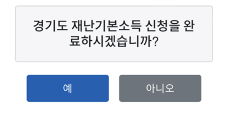 지급받을 신용,체크카드를 선택하면 위와 같은 페이지가 나옵니다. '예'를 누르면 경기도 재난기본소득 신청 접수가 끝나게 됩니다. 당일날 충전은 아니고 다음날 받게 됩니다.
