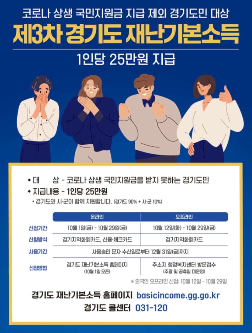 경기도 제3차 재난기본소득 신청 홈페이지 9월 23일 목요일은 추석 연휴가 끝나고 경기도에서 코로나 상생 국민지원금을 받지 못한 도민을 위해 공고를 한 날입니다. 경기도 남양주 의정부 과