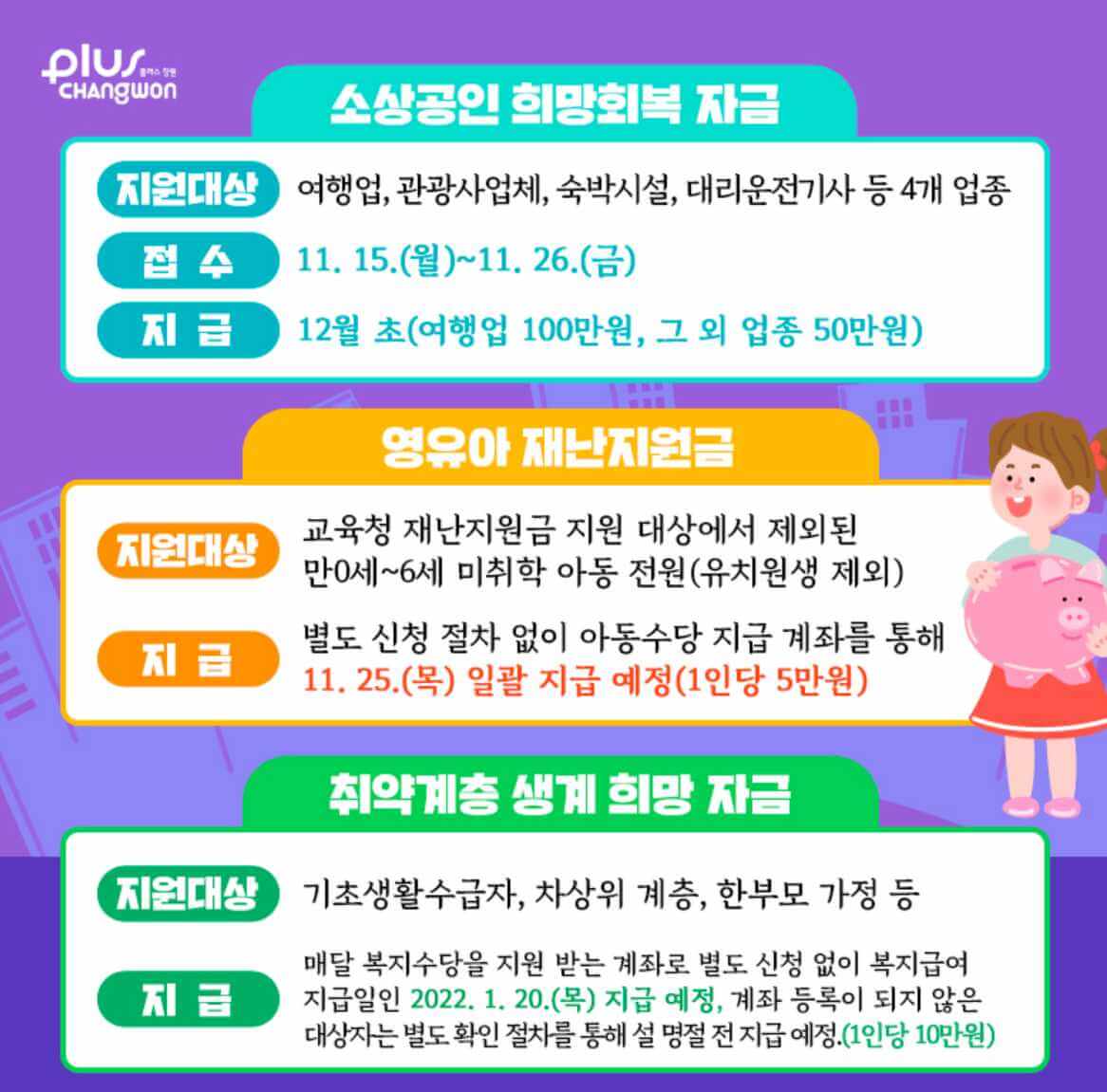 취약계층 생계 희망자금도 창원시는 기초생활수급자와 차상위계층 및 한부모 가정까지 다 챙깁니다. 2022년 1월 20일 목요일날 지급됩니다. 설 명절 전날까지 인당 오만원 정도 드립니다. 2023년에도 제 6차 창원형 재난지원금은 계속됩니다.