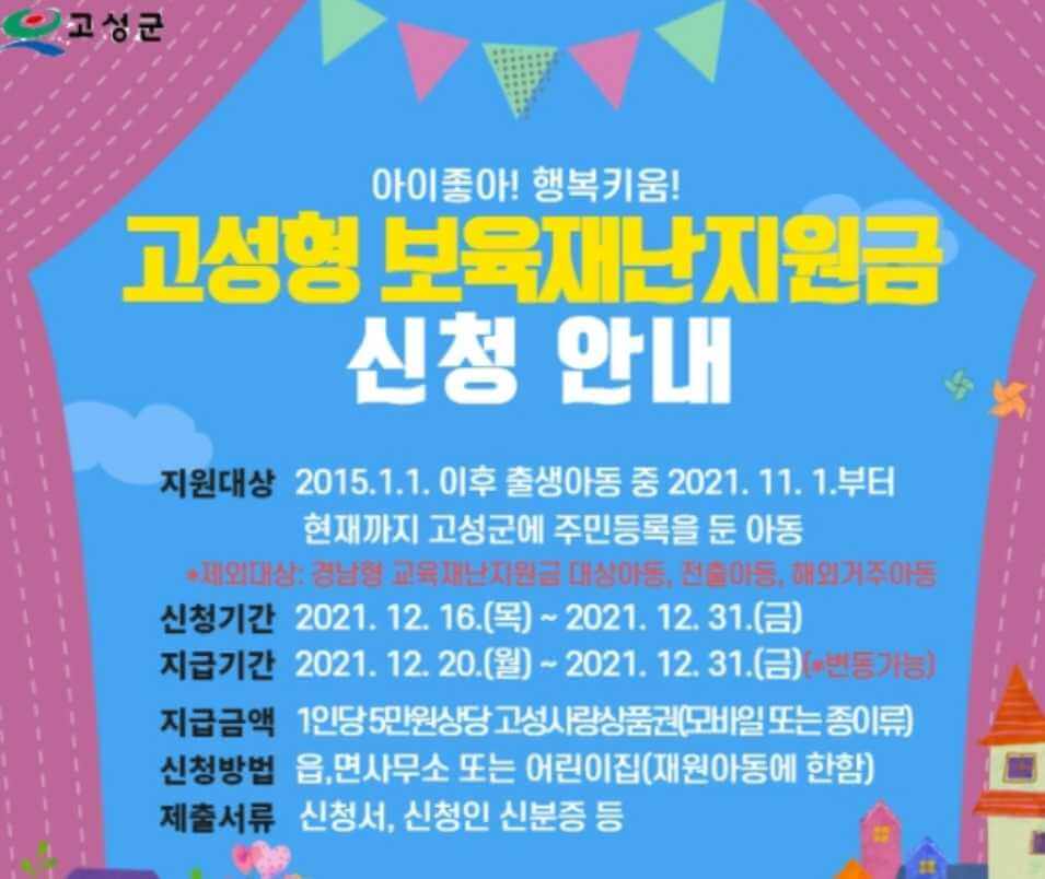 경남형 교육재난지원금 대상에서 제외된 영유아에게 드리는 것으로 2021년 12월 16일 목요일 ~ 12월 31일 금요일 사이에 신청하면 됩니다. 지급기간은 12월 20일 월요일 ~ 12월 31일 금요일까지 입니다. 2022년 임인년에도 고성형 보육재난지원금 신청은 홈페이지 없이 읍면사무소 또는 어린이집에서 받을 전망입니다.