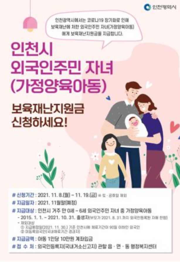 인천은 내국인 뿐 아니라 외국인 주민자녀까지 챙기는 가정양육아동 대상으로 보육지원금까지 드립니다. 아동수당을 지급하는 지자체가 많은 만큼 본인이 사는 주거지에서 일어나는 정책이면 얼릉 받아가세요.