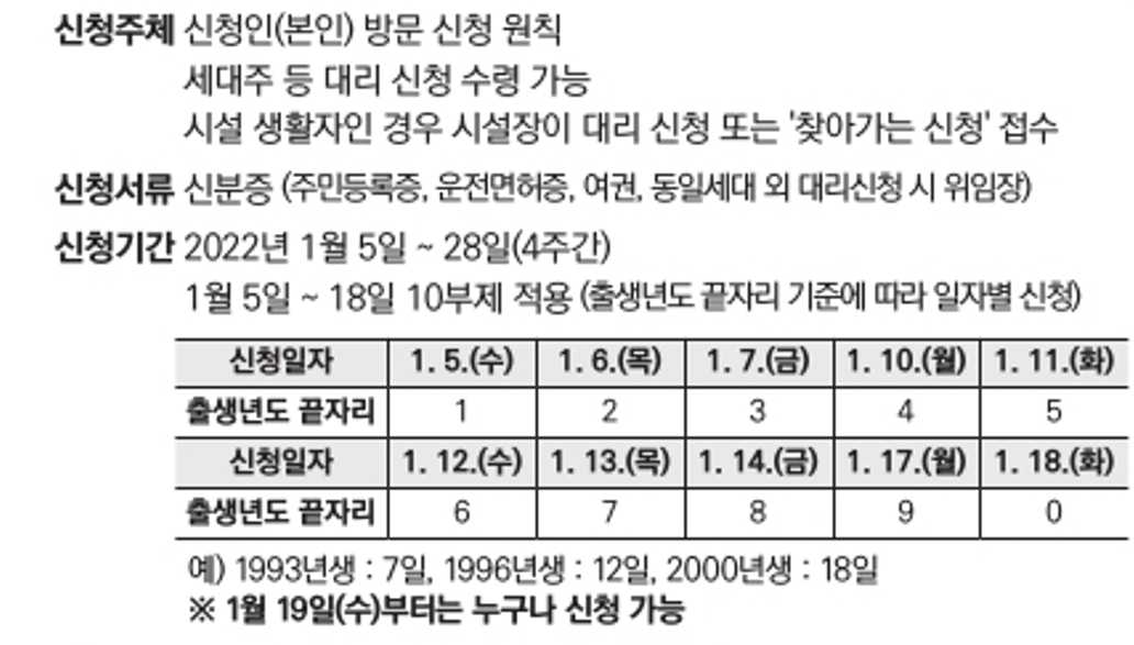 신청하는 기간은 2022년 1월 5일 ~ 28일까지로 4주 동안 입니다. 참고로 1월 5일 ~ 18일까지는 출생년도 끝자리를 기준으로 10부제를 적용합니다. (단, 기초생활수급자는 12월 27일부터 1월 21일까지 지급합니다. 1주 동안 먼저 지급하는 방침을 두고 있습니다.)