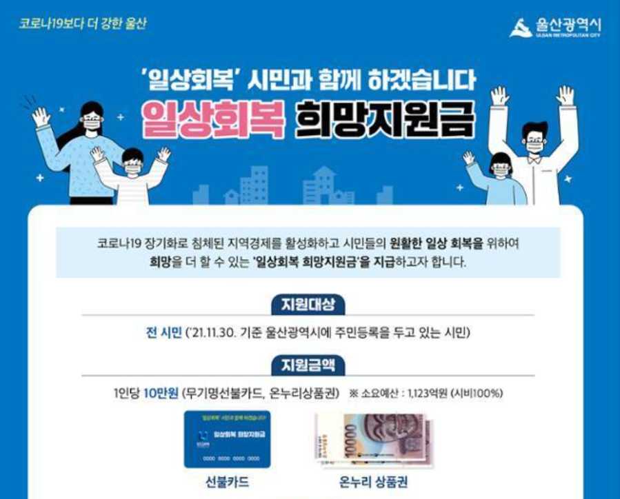 11월 30일 기준으로 울산 광역시에 주민등록 주소지를 둔 모든 시민이 일상회복지원금의 대상입니다. 통계상 수치로는 112만 2566명으로 나오며 전원에게 1명당 10만원의 울산 희망지원금을 드립니다. 4인 가구라면 40만원까지 받을 수 있습니다.