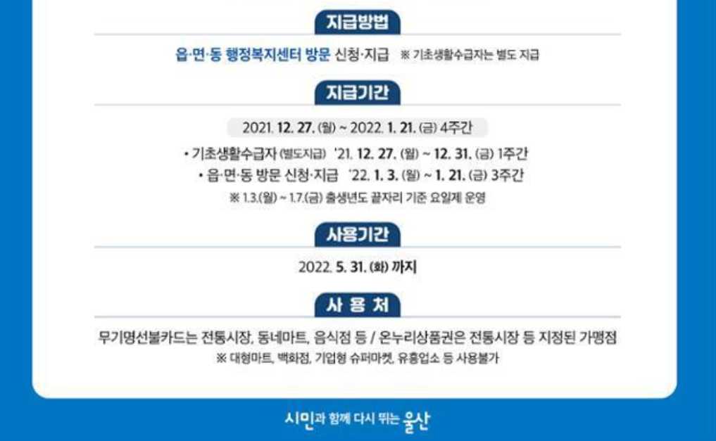 대전, 인천, 순천의 기세를 이어 울산 일상회복지원금 신청하고 10만원 받아쓰는 선불카드와 온누리상품권 사용처를 알려드립니다. 울산시에서는 일상회복을 앞당기고 지역경제를 활성화시키고자 합니다. 특정 누군가에게만 할당되는게 아닌 전시민 모두에게 1인당 십만원을 균등하게 배분합니다.
